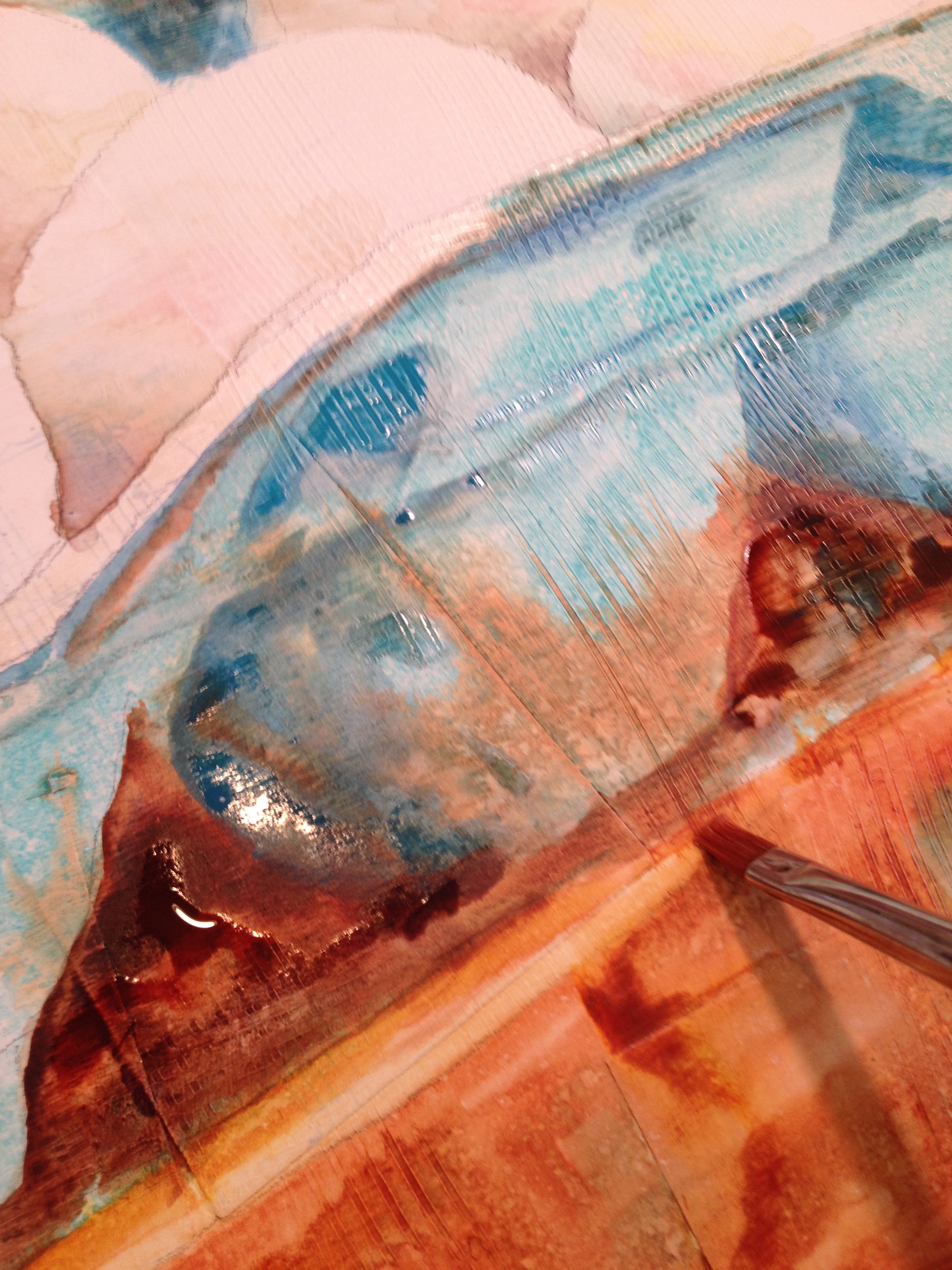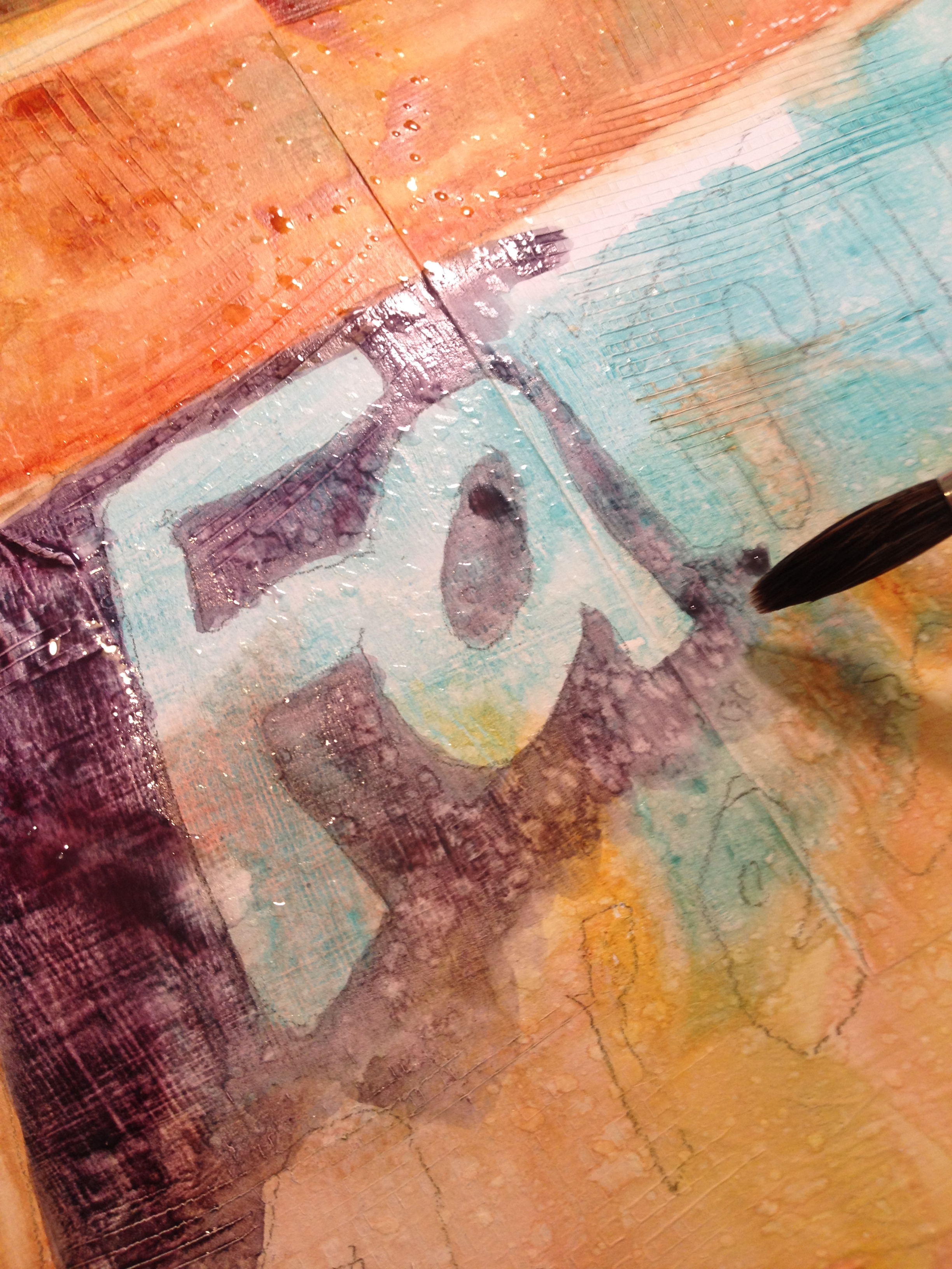 The lettering on the front of the box was fun to do.  I painted the whole area with an underpainting of Cobalt Teal, quinicrodine Burnt Orange, New Gamboge, and a touch of quin. rose.  I allowed the area to dry, then went in behind some of the letters with Moonglow to pop them out.