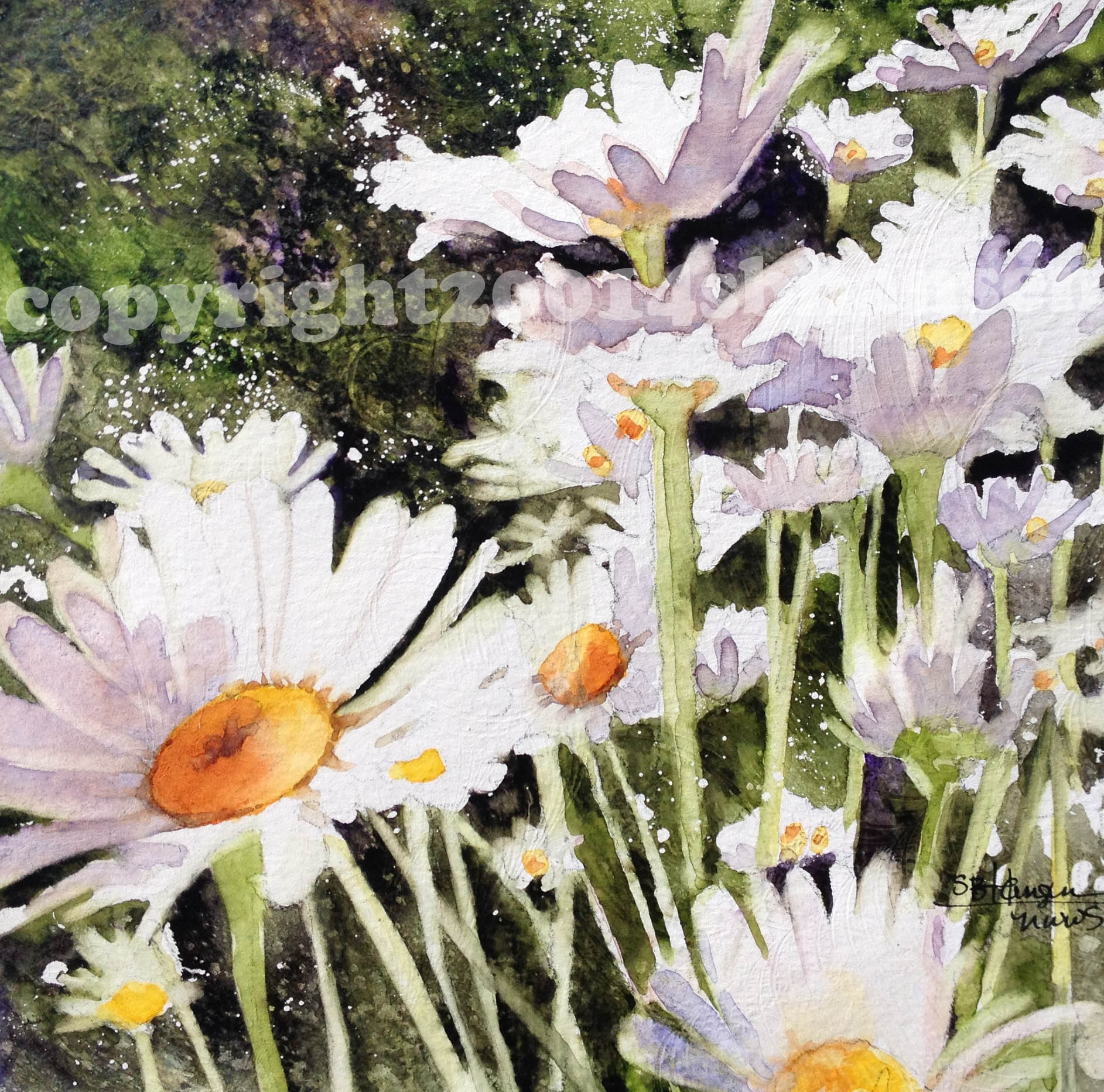 Good morning, everyone! Happy Thursday! Happy Thirty-Dollar Thursday, I mean to say. Here’s my thirty-dollar painting today. The painting is as bright and cheery as the daisies were when I walked past them at the Old Mill by the Colorado Bridge on my lunch hour this week. I just HAD to snap a photo of their sunny faces, tossing around in the breeze.