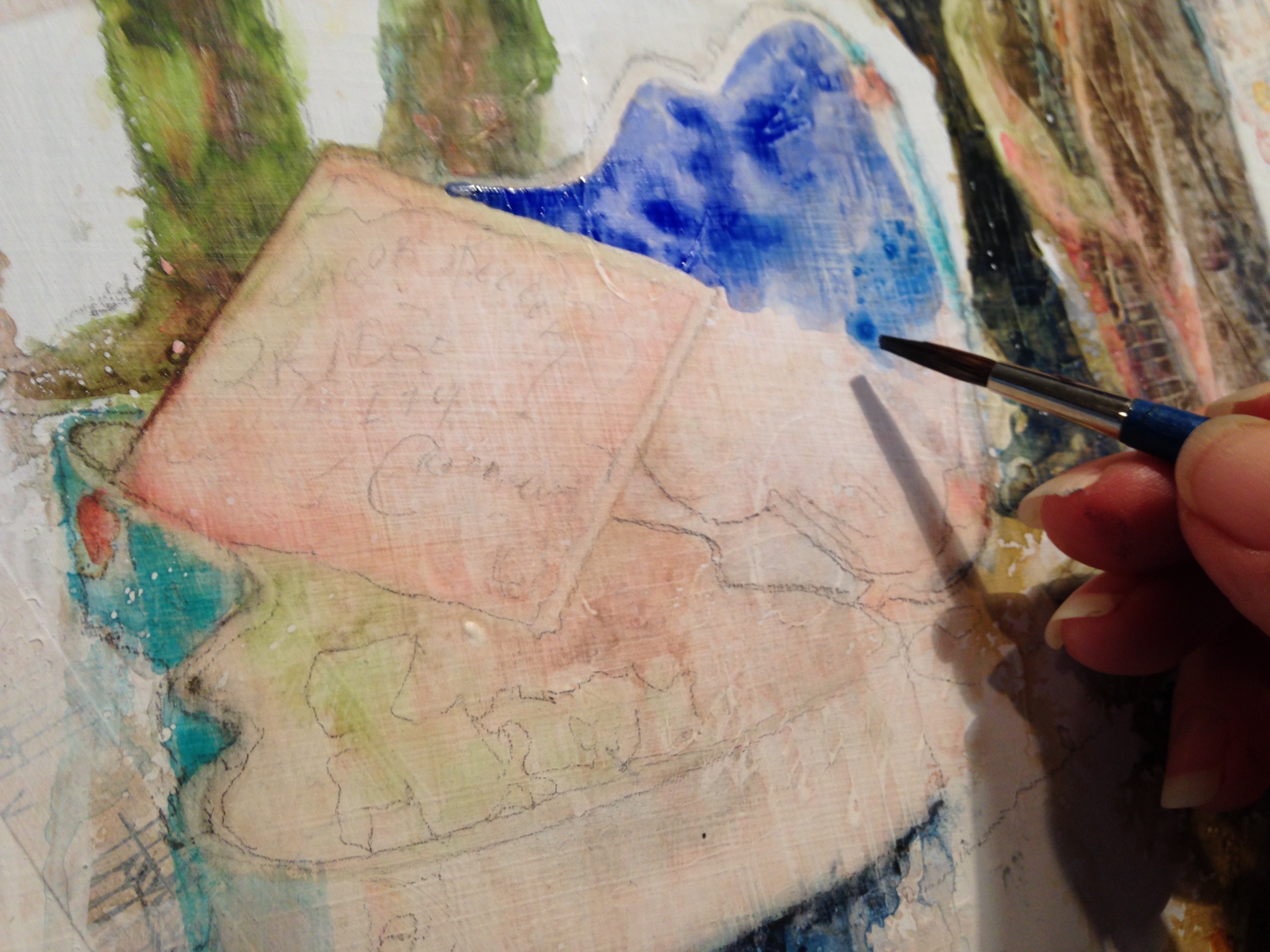 I didn’t like how the Sodalite muddied up most of the colors. It is better used with cool tones. Since this painting is mostly warm, the paints didn’t play nicely with one another. I removed most of the Sodalite with a wet brush and went back into the painting using Ultramarine Blue as my dark receding values.