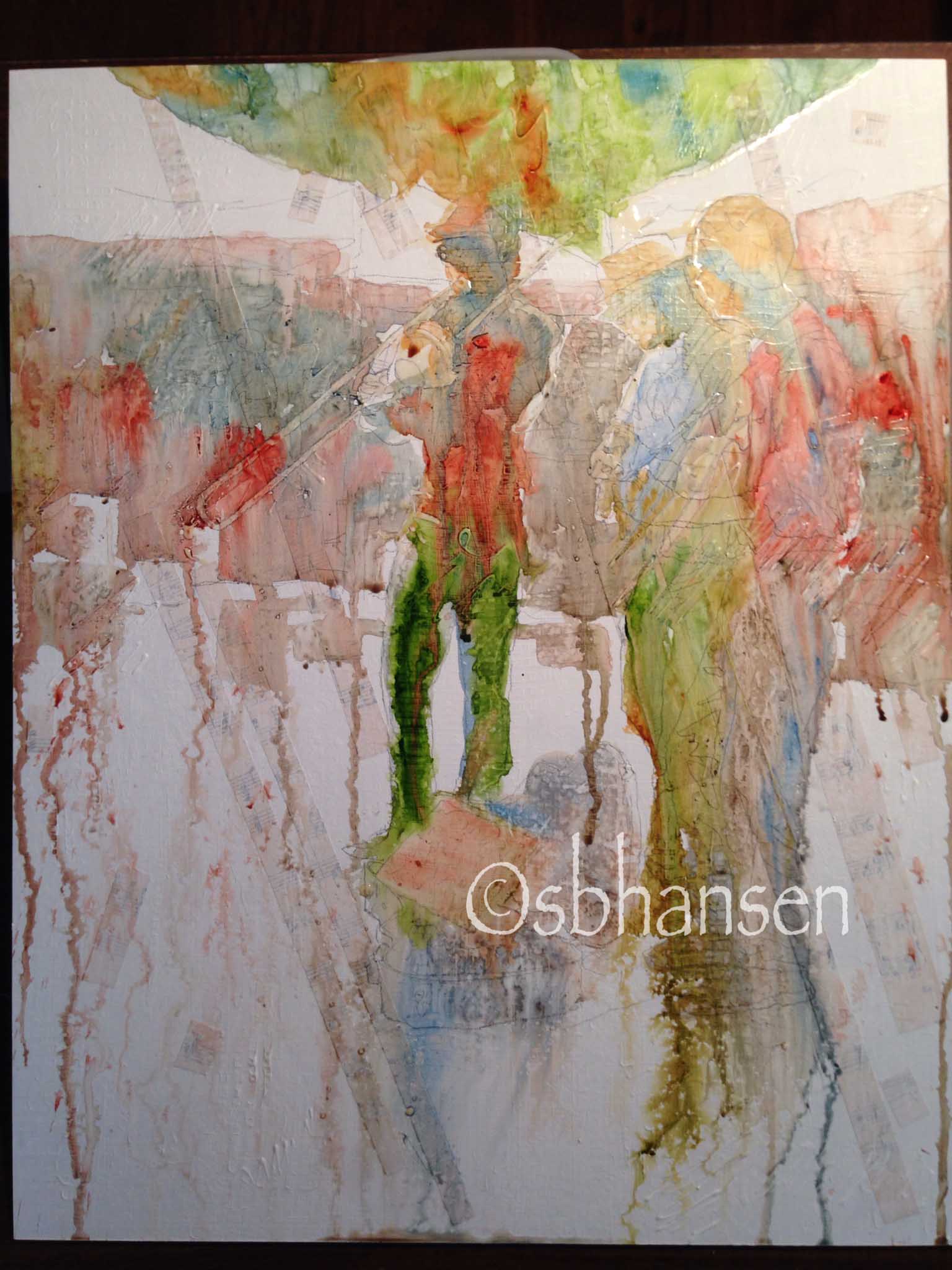 Below, I replaced the Sodalite with Ultramarine Blue in the background trees. Plastic wrap protects the musicians from getting water drops on them.