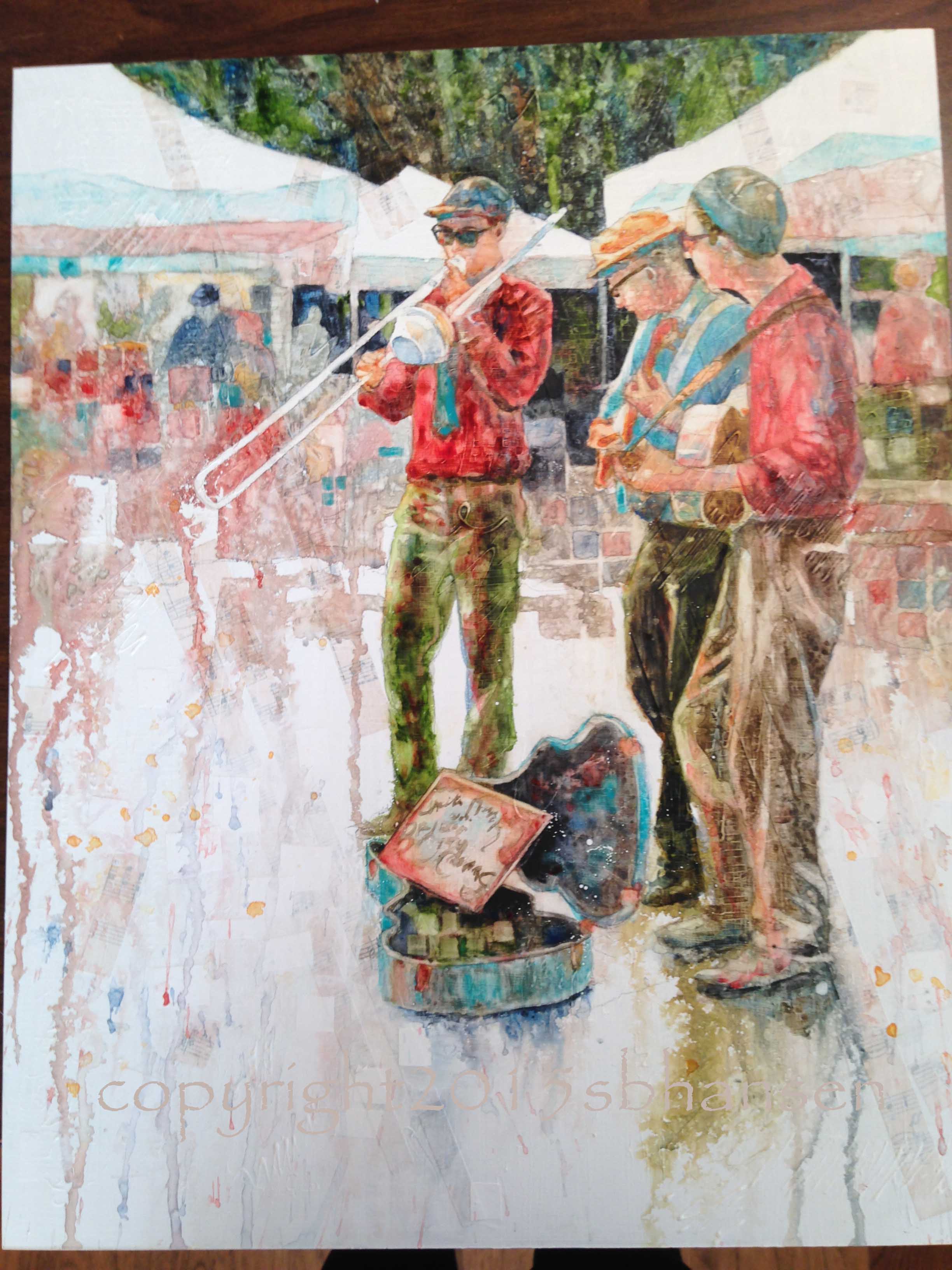 I began by layering in collaged strips, along with randomly placed squares of sheet music, symbolizing their songs permeating through the market. Shiny areas shown below are dried liquid mask, protecting the whites of the gessoed plexiglass. I also used 3-D fabric paint to scribble on the surface, further illustrating the rhythm of the music and chaos of colors, smells, and sounds.