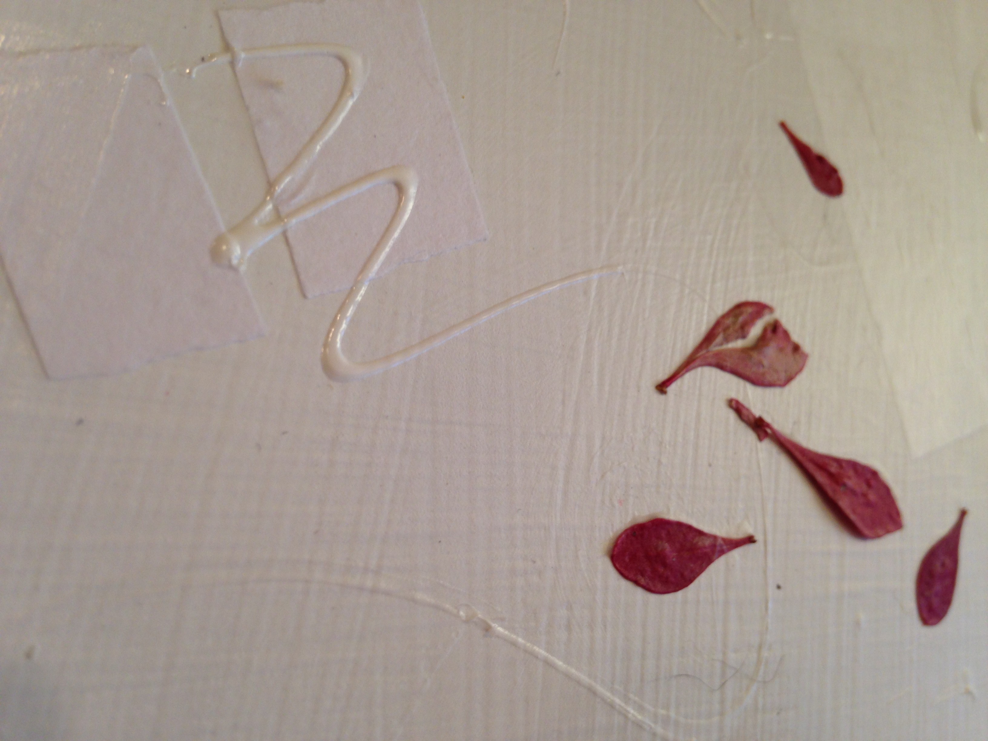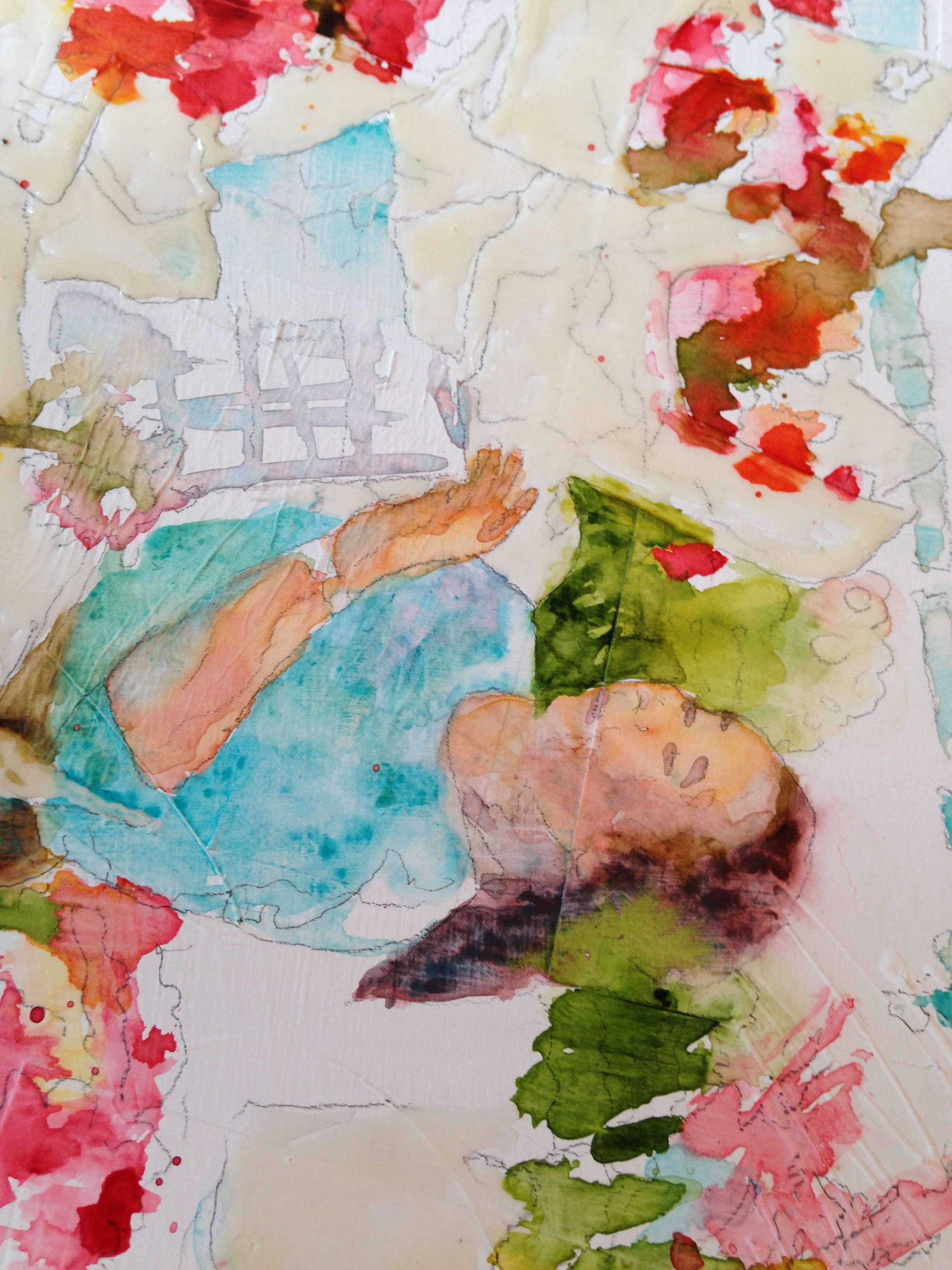 I began the painting my flower vendor by texturing the plexiglass, using real flower leaves and fabric paint, as well as collaged squares: