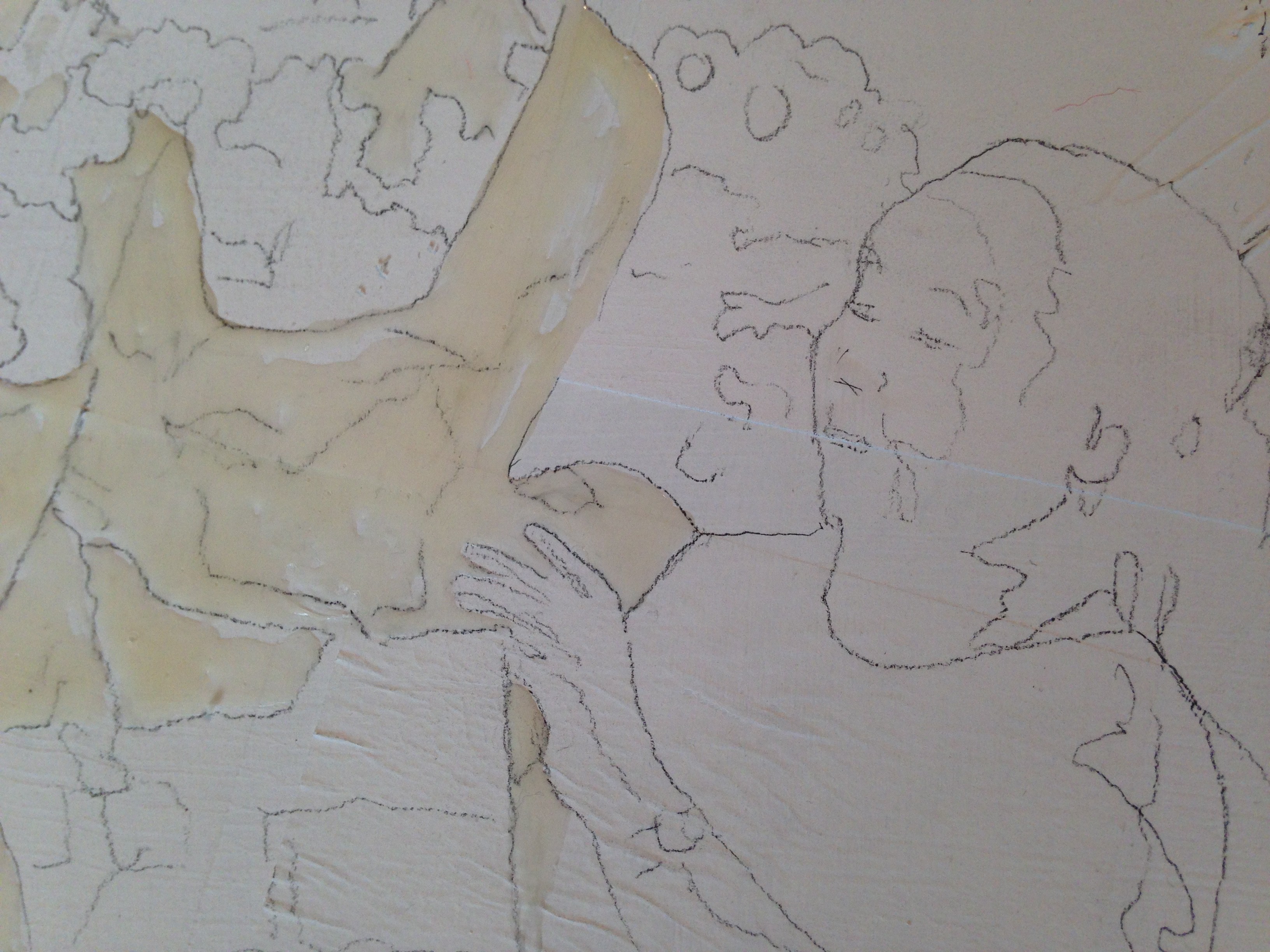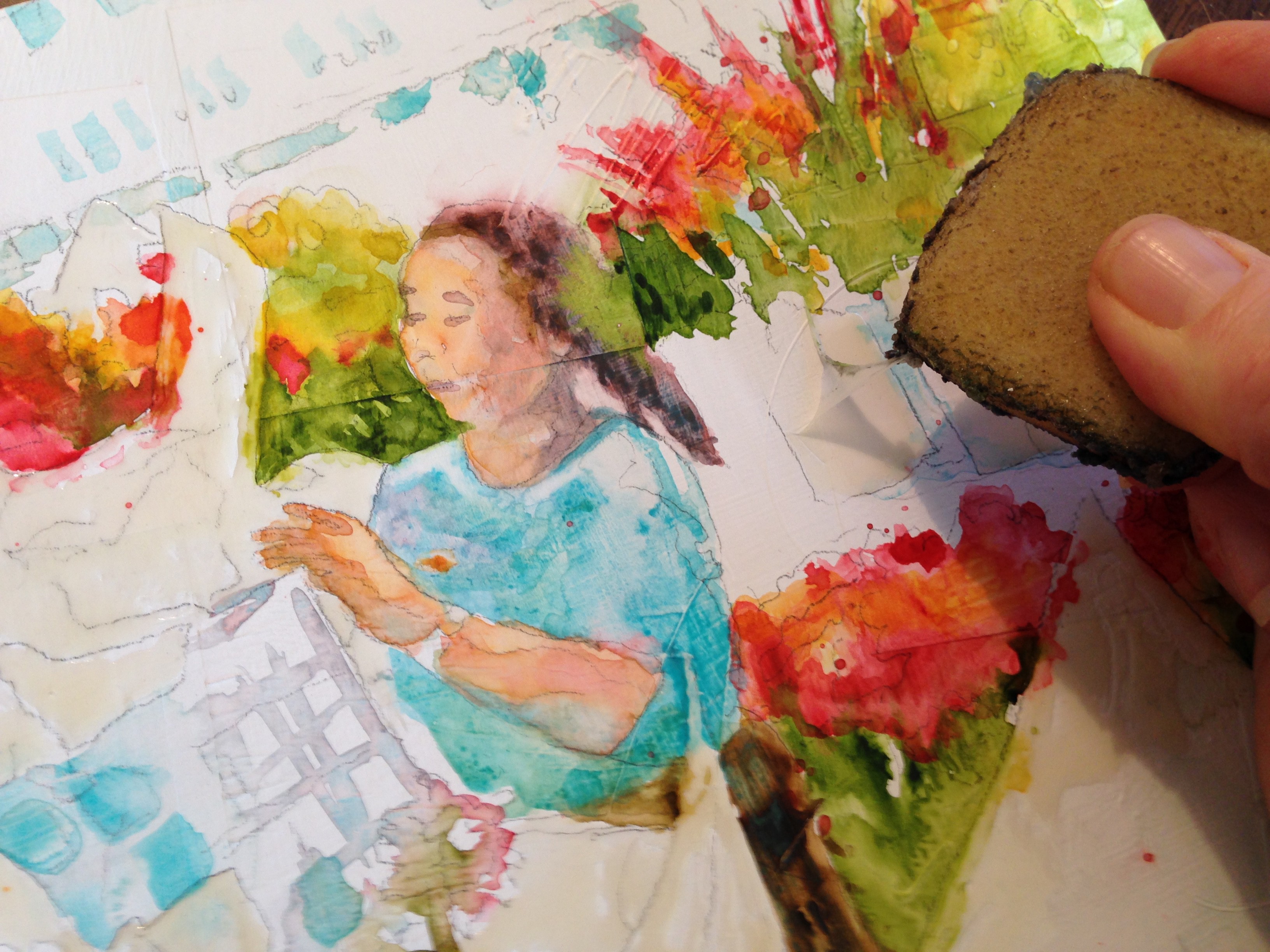 After the gesso and collage dried, I drew in the composition and began painting the beautiful flower vendor.