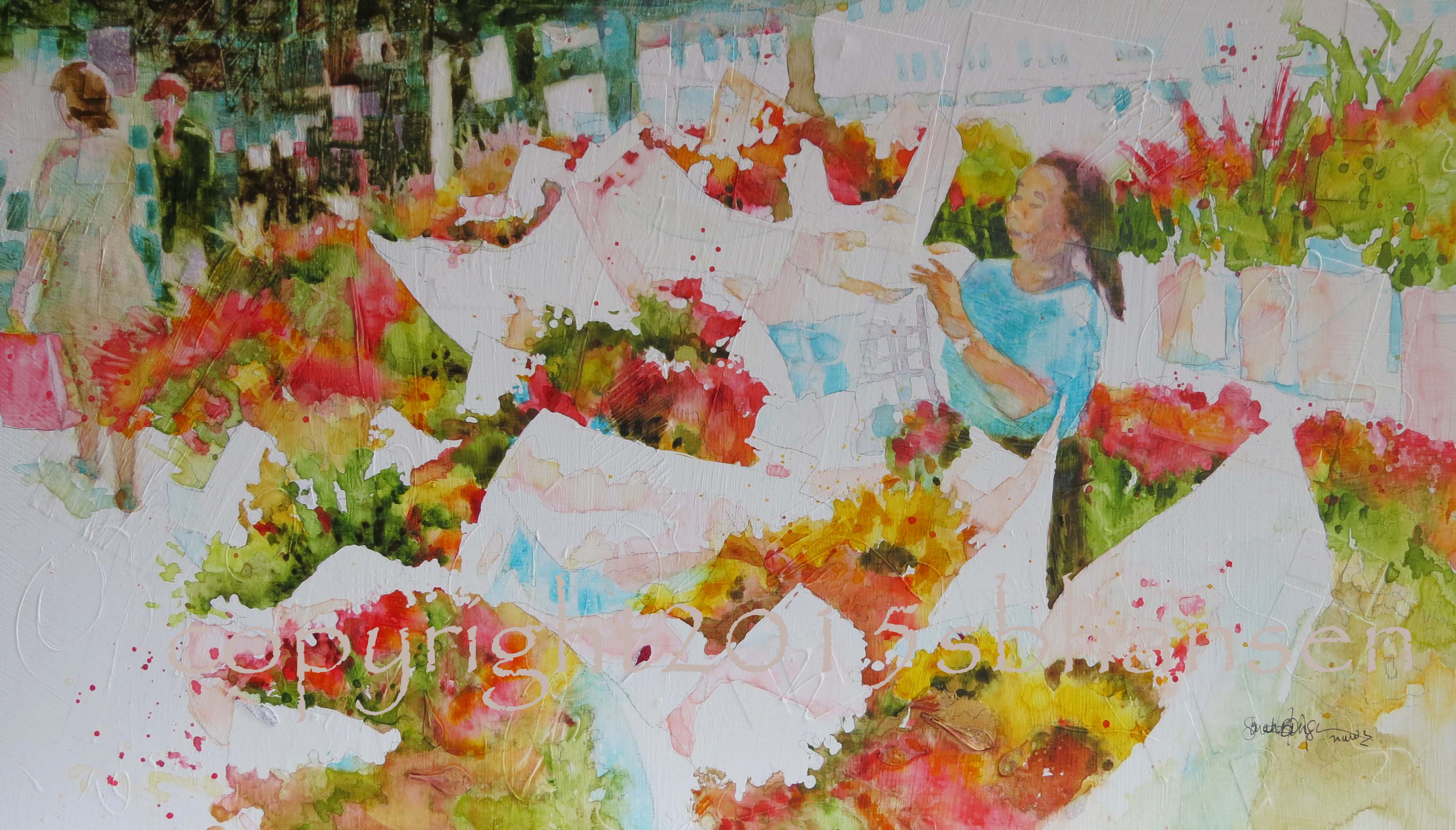 This painting today is about being where you are. I’m capturing, for you and for me, that moment of brightness at Seattle’s Pikes Place Market. Can you smell the flowers? Hear the music and the voices? Taste the cookie sample on your tongue?