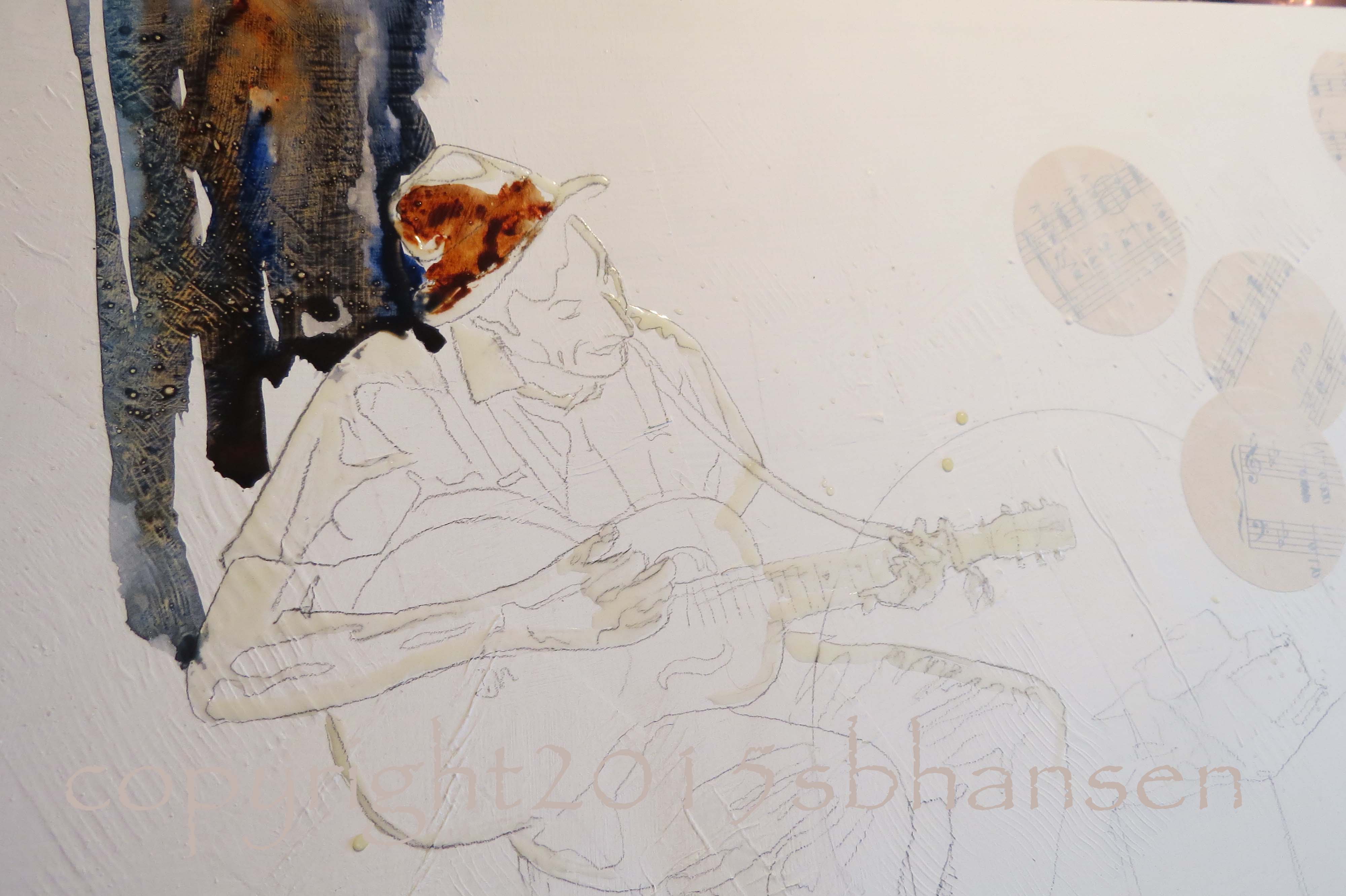 Once I finished the background, I introduced color into the musician and his clothes. Red/orange seemed a good choice, contrasting sharply with the background blues. His tie is cerulean, connecting again with the background.