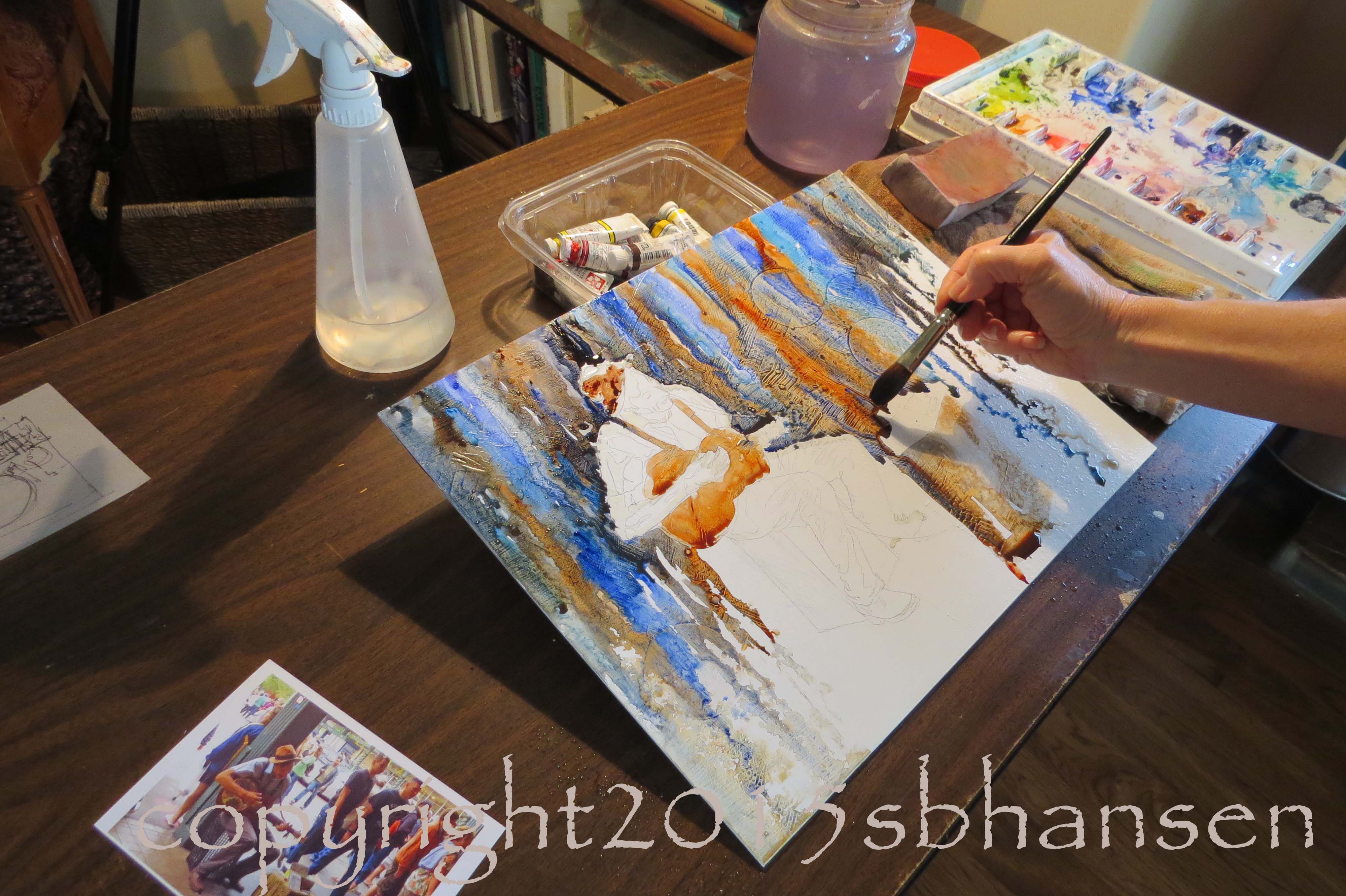 Once I painted the colors and values, I removed the liquid mask I had applied earlier, to reveal the reflected whites on top of the musician’s clothes. I used a damp brush to soften lines in the clothes.