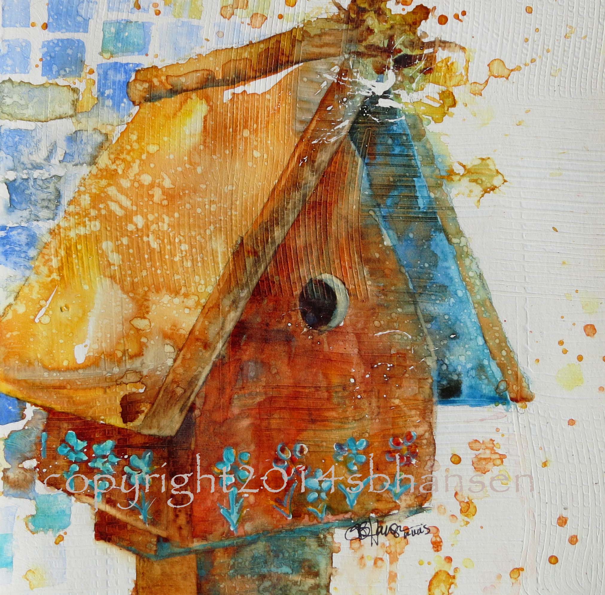 So in anticipation of spring, I offer up my small little painting this Thursday, called “Flowered Birdhouse”.