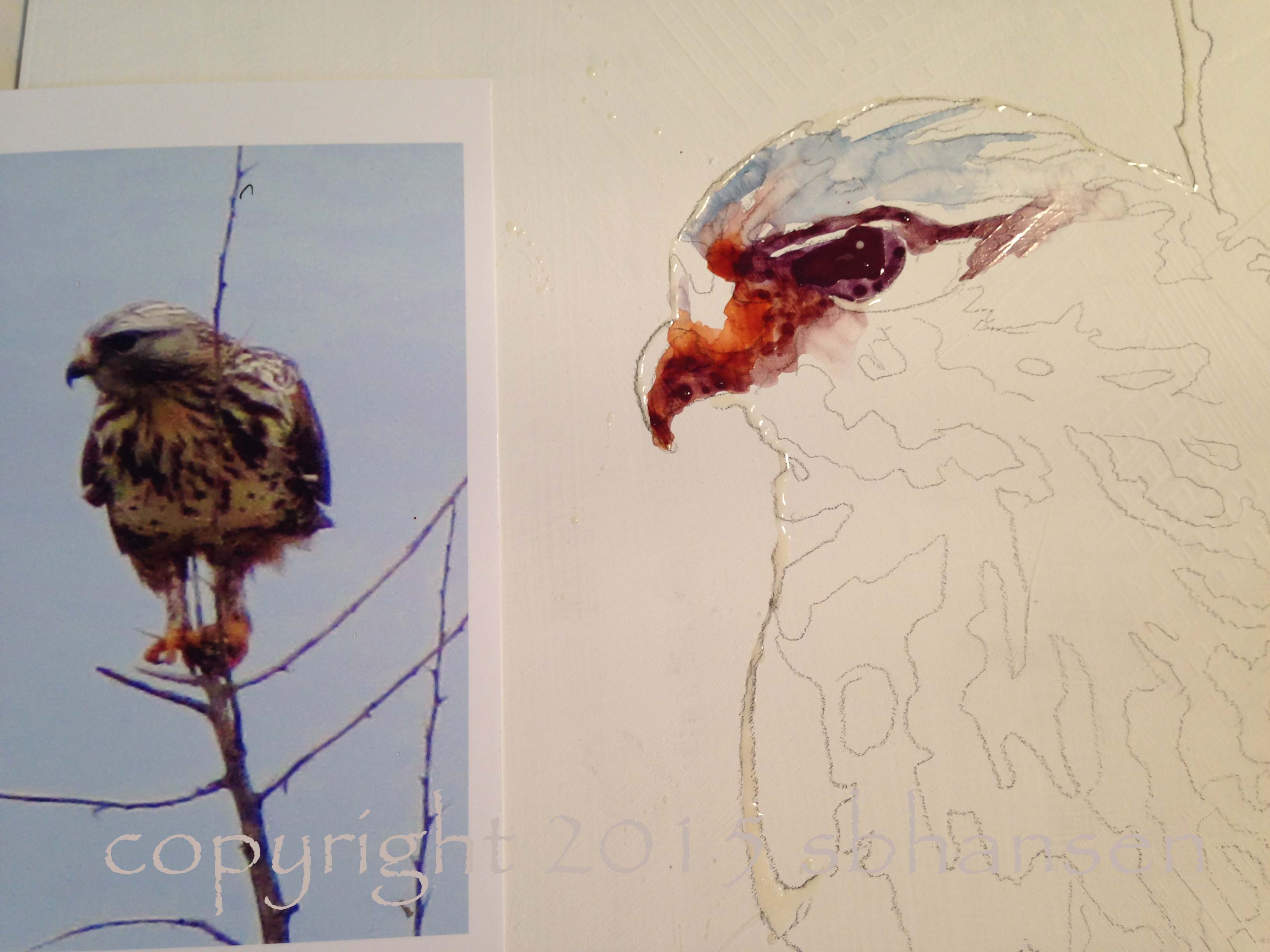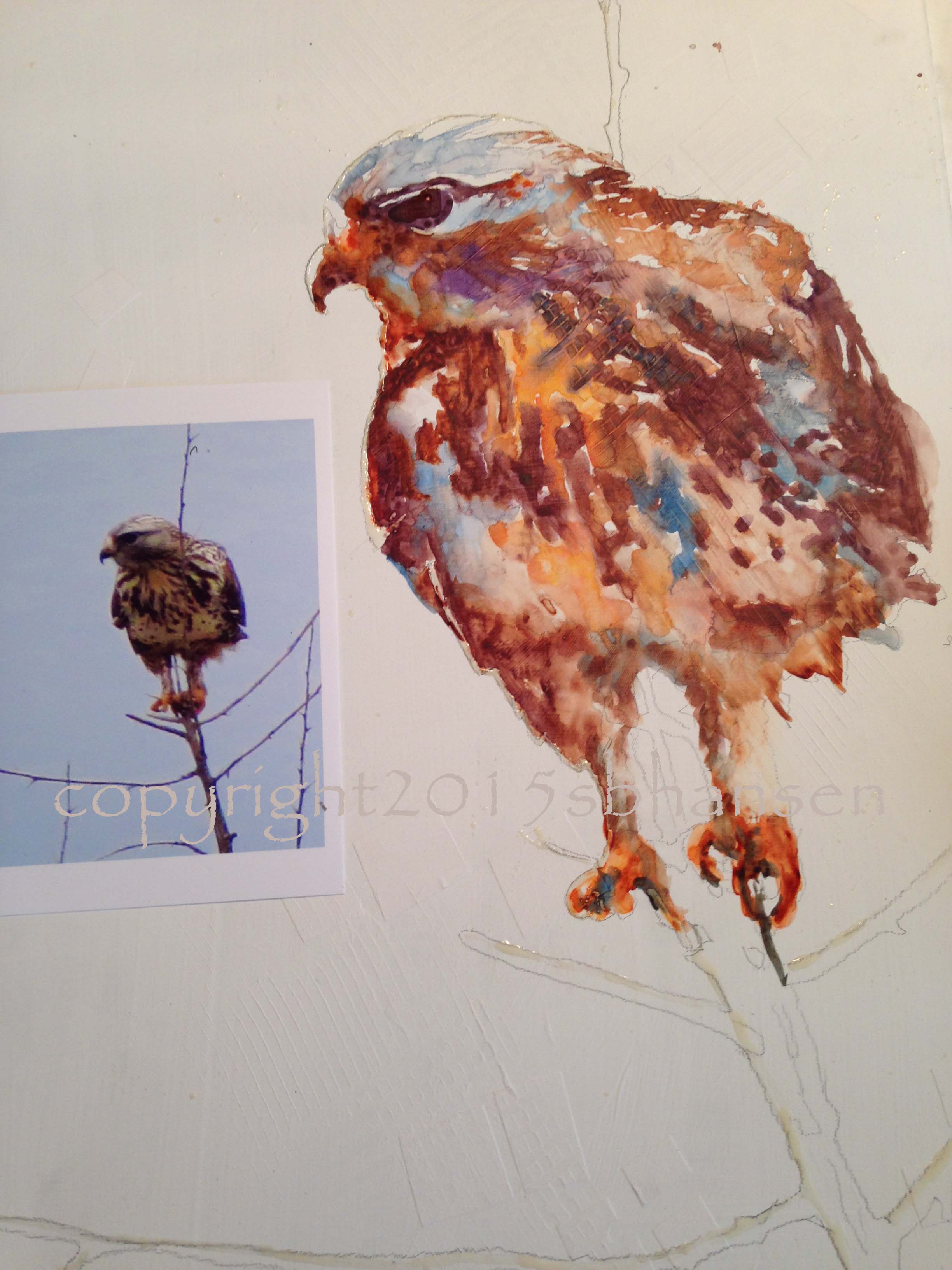 After I finished laying in the general colors of the falcon, I began applying the background. I wanted this painting to be different, striking in its values, composition, and unique properties. But I came up blank and decided to go with a calm background of distant hills and Malheur Lake to contrast with the hawk’s intensity and dark values near his head. I added texture to the foreground, by spattering water and paint.