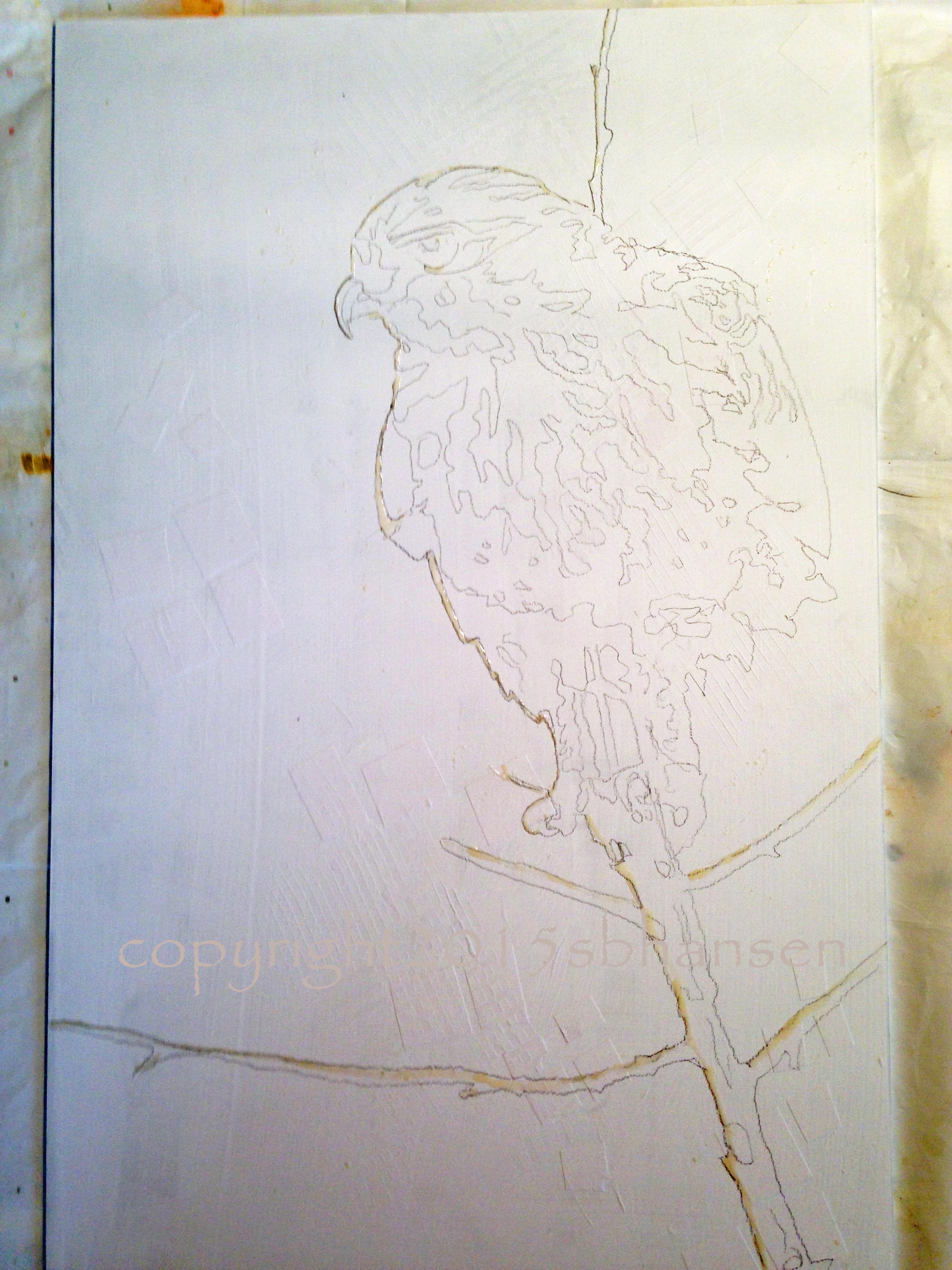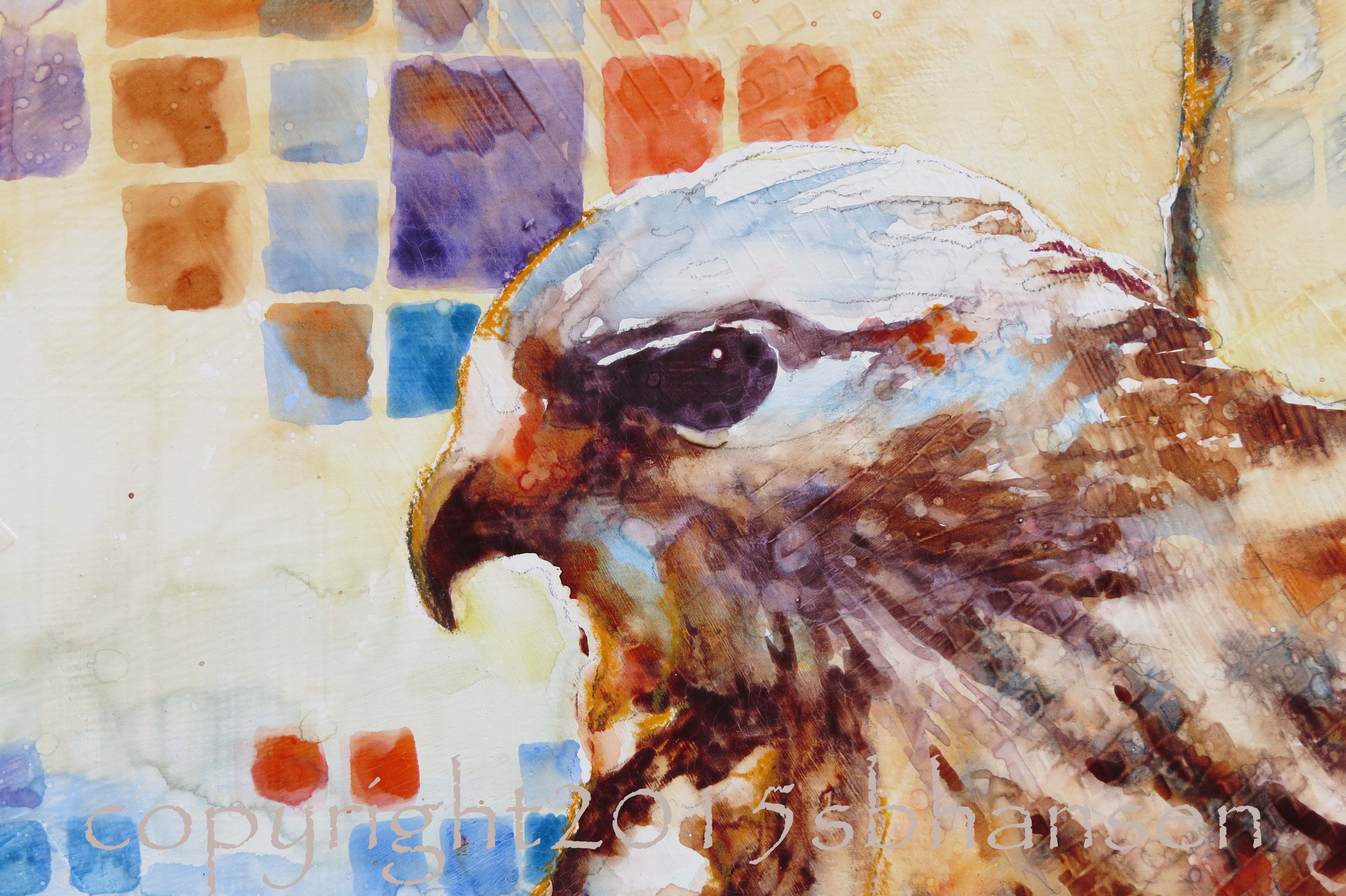 Above, you can see the detail of the falcon head, with its intense gaze peering off to the LH side. I chose to highlight its head with cobalt blue from the sky, knowing that I would likely be placing warm colors behind it, reminiscent of the Eastern High Desert of Oregon grasses and scrub brush.