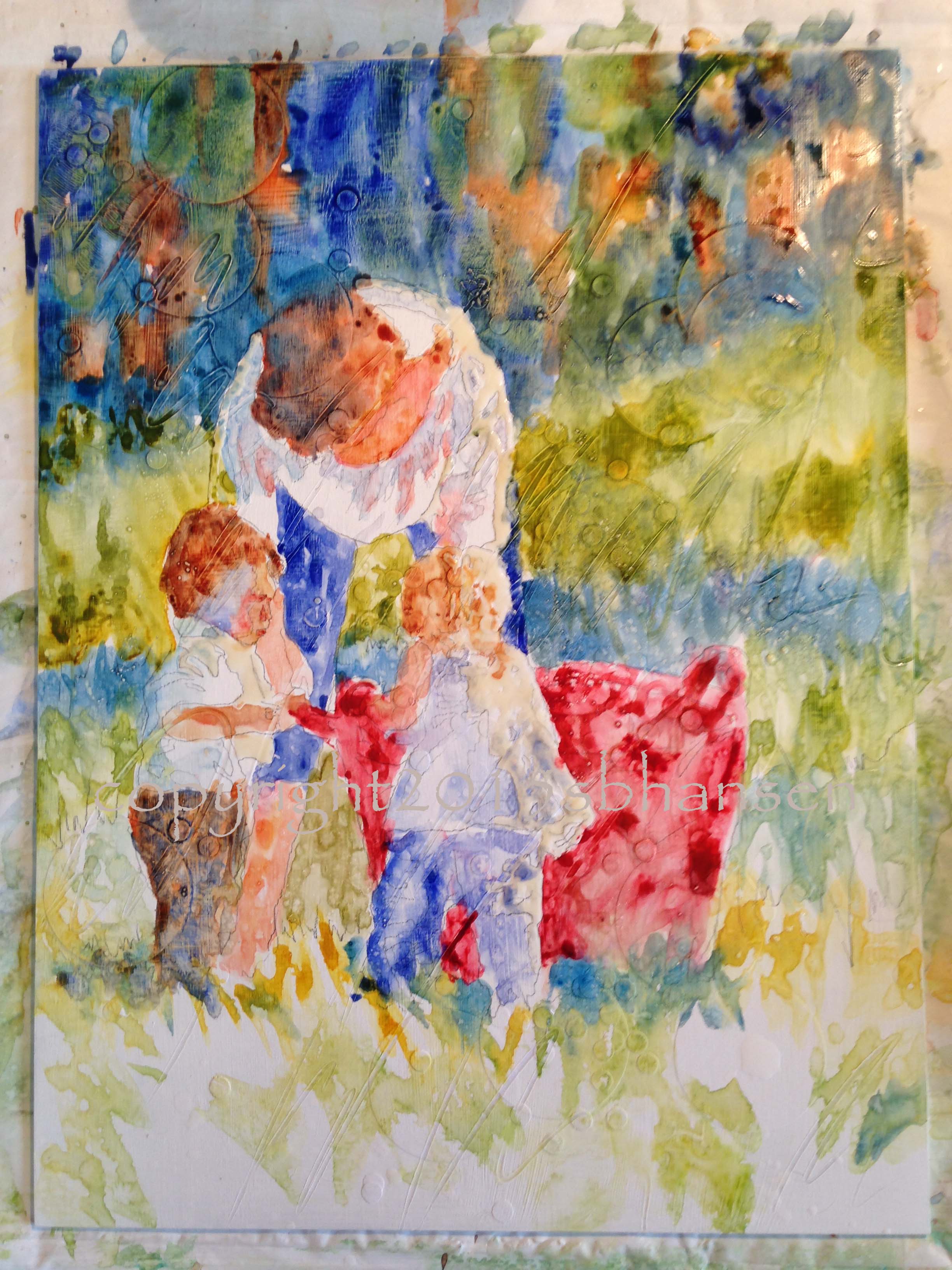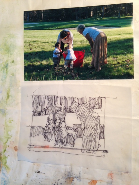 By adding splatters of light and water within the paint, I added to the magical feel of this painting. There is a glow of late afternoon light coming from west, lighting up the white shirts of all three figures. The red bucket has smudged edges, indicating that imagination is not always defined from real life. The boy is wondering what his older sister has planned, and looks on, with a small toy in his hand. Grandma is gently guiding the imaginations of the two, creating play and interaction with the toys in the bucket. The foreground and background is undefined, letting the viewer imagine the surroundings of the three figures. This painting is more about evoking a feeling of imagination and connection than perfectly articulating each figure and space.