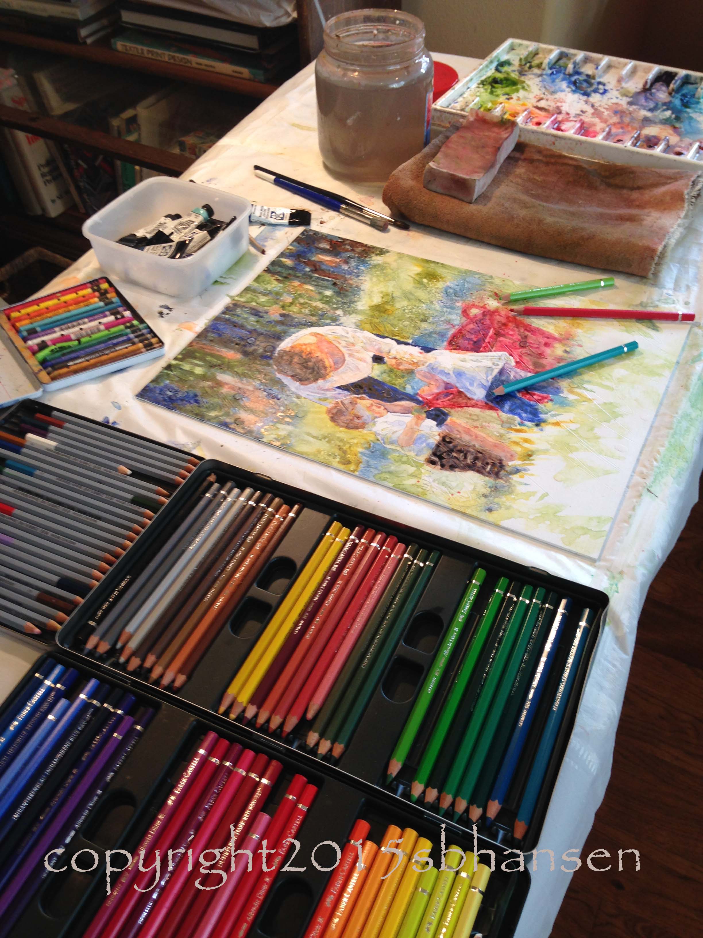 I focused on keeping the painting loose and colorful. After the painting was 95% finished, I worked in lines and definition, using watercolor pencils.
