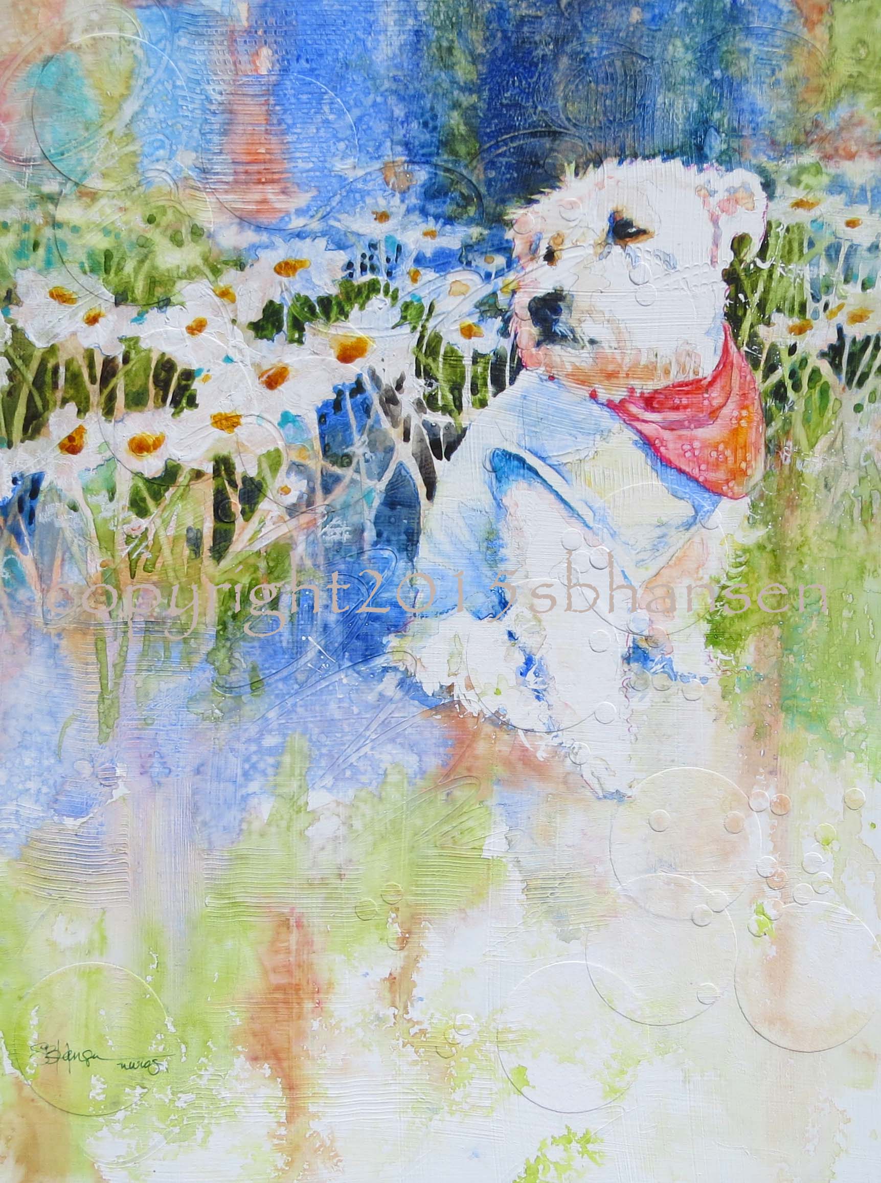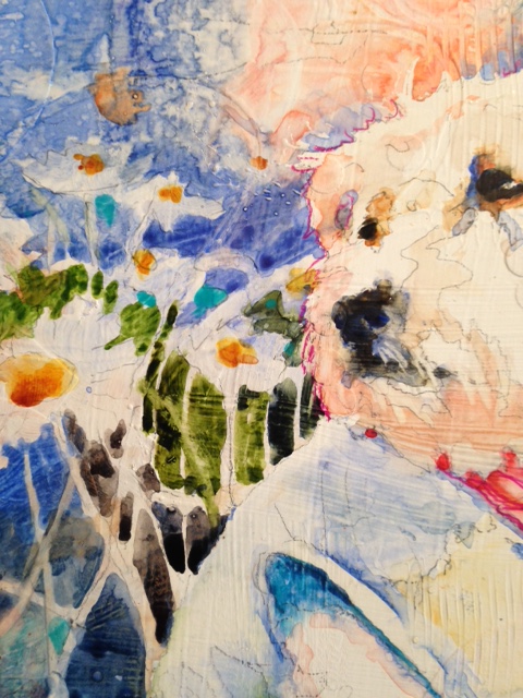 For this week’s painting, I began with a cute photo of a white dog modeling a scarf and a shirt(?). Daisies became the natural choice for the background. They grow in profusion here in Bend in the summer, especially downtown. I imagined the whites of the flowers playing off her fur, and adding structure and cheer to the painting.