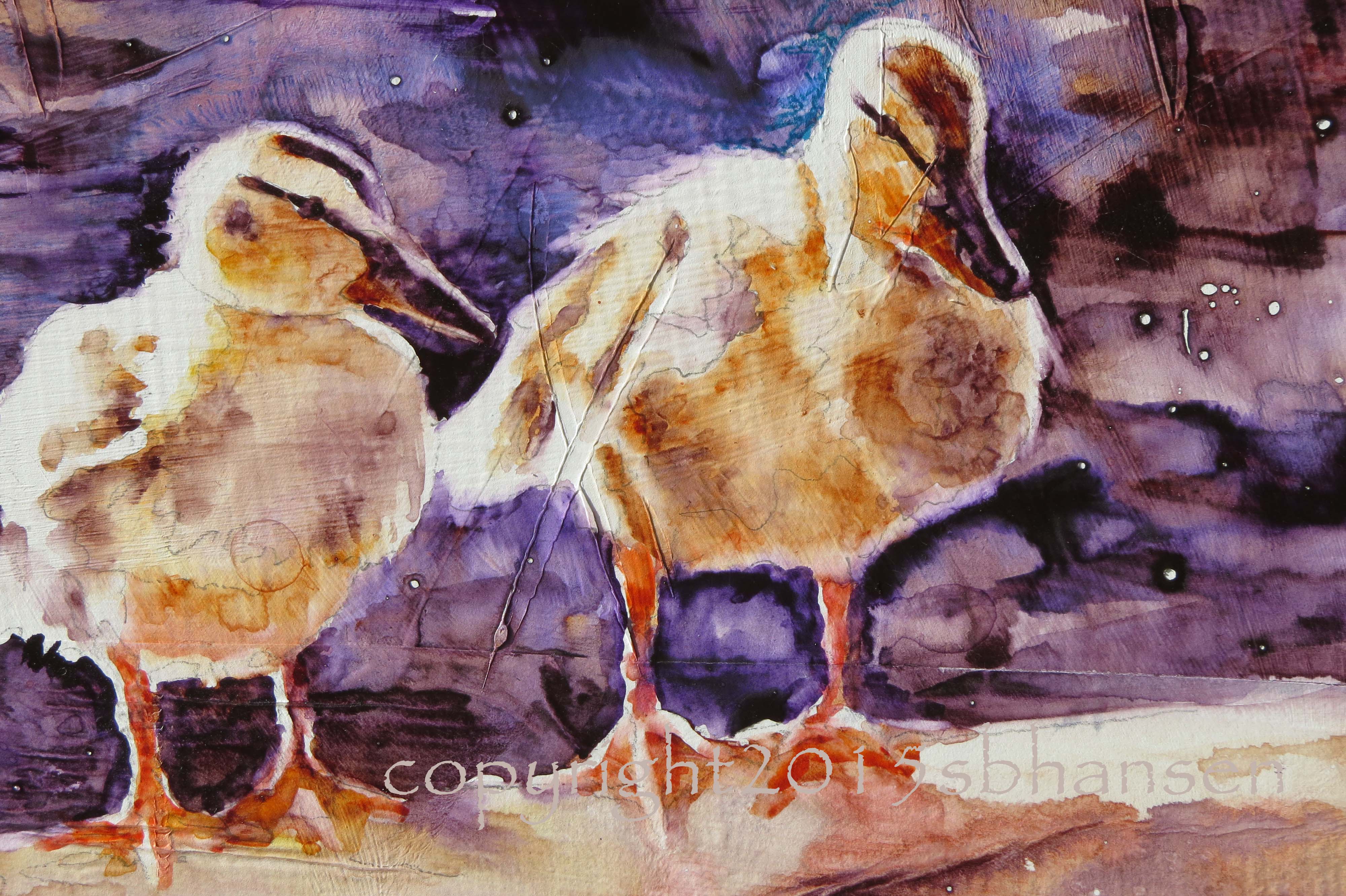 I painted the first wash quickly, deciding to use purple and quinocridone burnt orange as my two main colors, creating a somewhat neutral color palate with a strong horizontal line of dark value behind the ducklings. Since I wanted the small duck with his foot outstretched to be the focal point, I removed a chick to the immediate left to give him a little space. I had used liquid mask on all the areas of their highlighted downy feathers, to keep it sparkling white in the end.