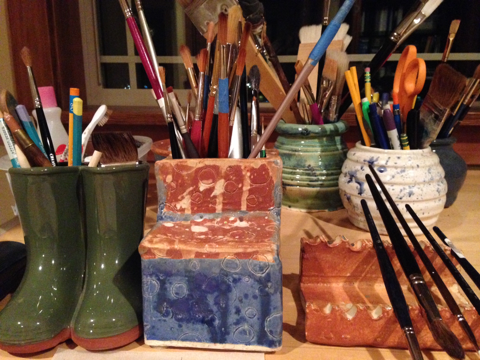 My boys had each taken a ceramics class in high school. I inherited their self-made vases. They make perfect holders for brushes, and remind me of their high school days. The little boots were given to me as a gift. Instead of holding flowers, I use them for brushes and pencils. The little nifty ceramic thing to the right is something my son made me to allow my brushes to dry on a slant. Pretty cool, huh? These items always sit on top of my drafting table.