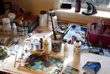 Look at all those yummy tubes of paint. Just waiting for fabulous creations of landscapes by Janice! She complains that it’s messy. But it works! Here they are, in all their glory. Organized by color in plastic containers. I mean, in the throes of creativity, does it matter from which your paint tubes come? Here is her studio: