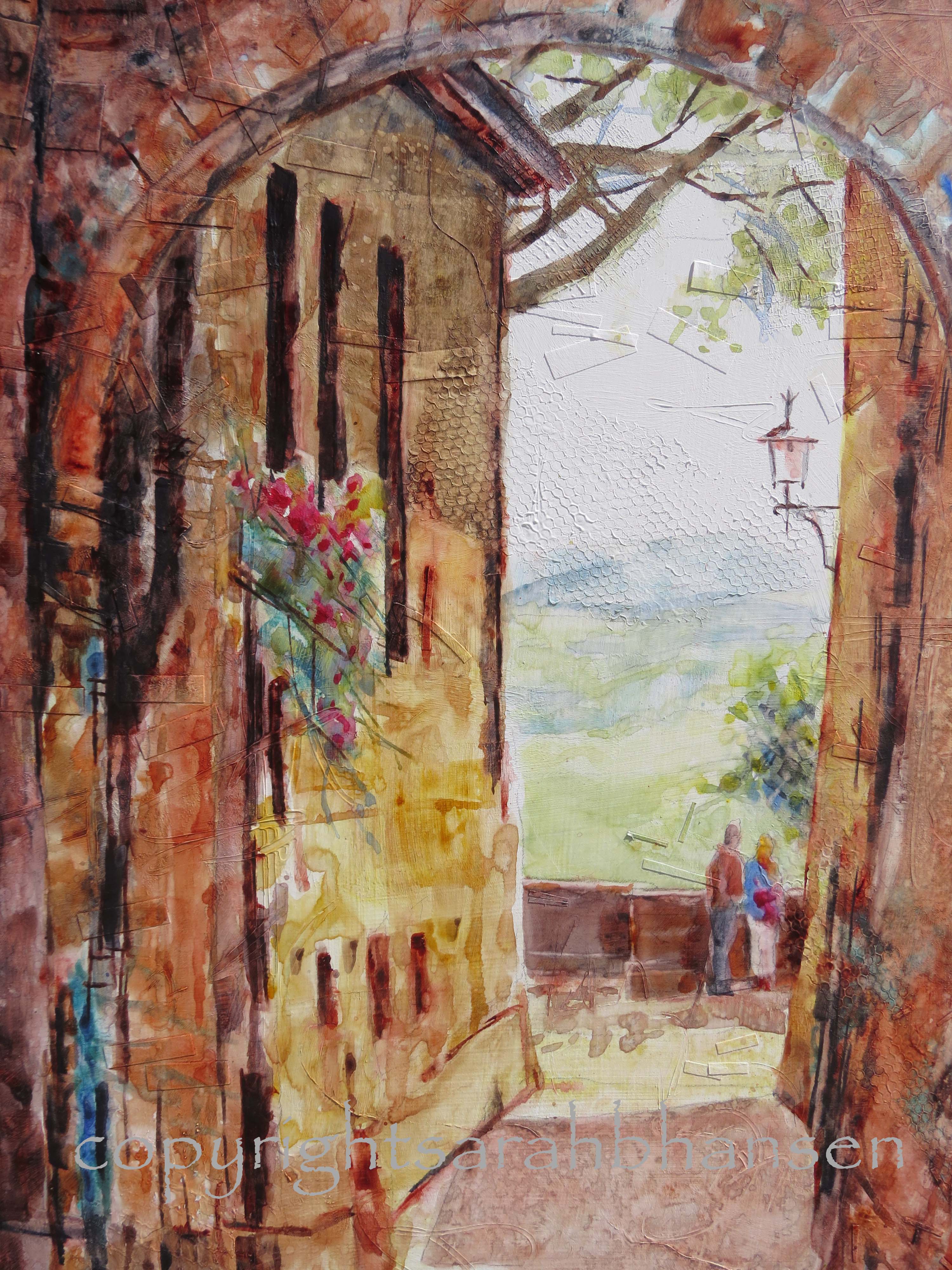 I painted this scene for several reasons. First, of course, to capture the gorgeous Tuscan light. But I also love the archway and the dark foreground drawing us in to a misty Tuscan landscape. A couple pause to contemplate the valley view, which adds a human element to the scene. I am also drawn to the lamp on the wall to the right. I decided accentuate a triangular composition highlighting the window box, lamp, and people.