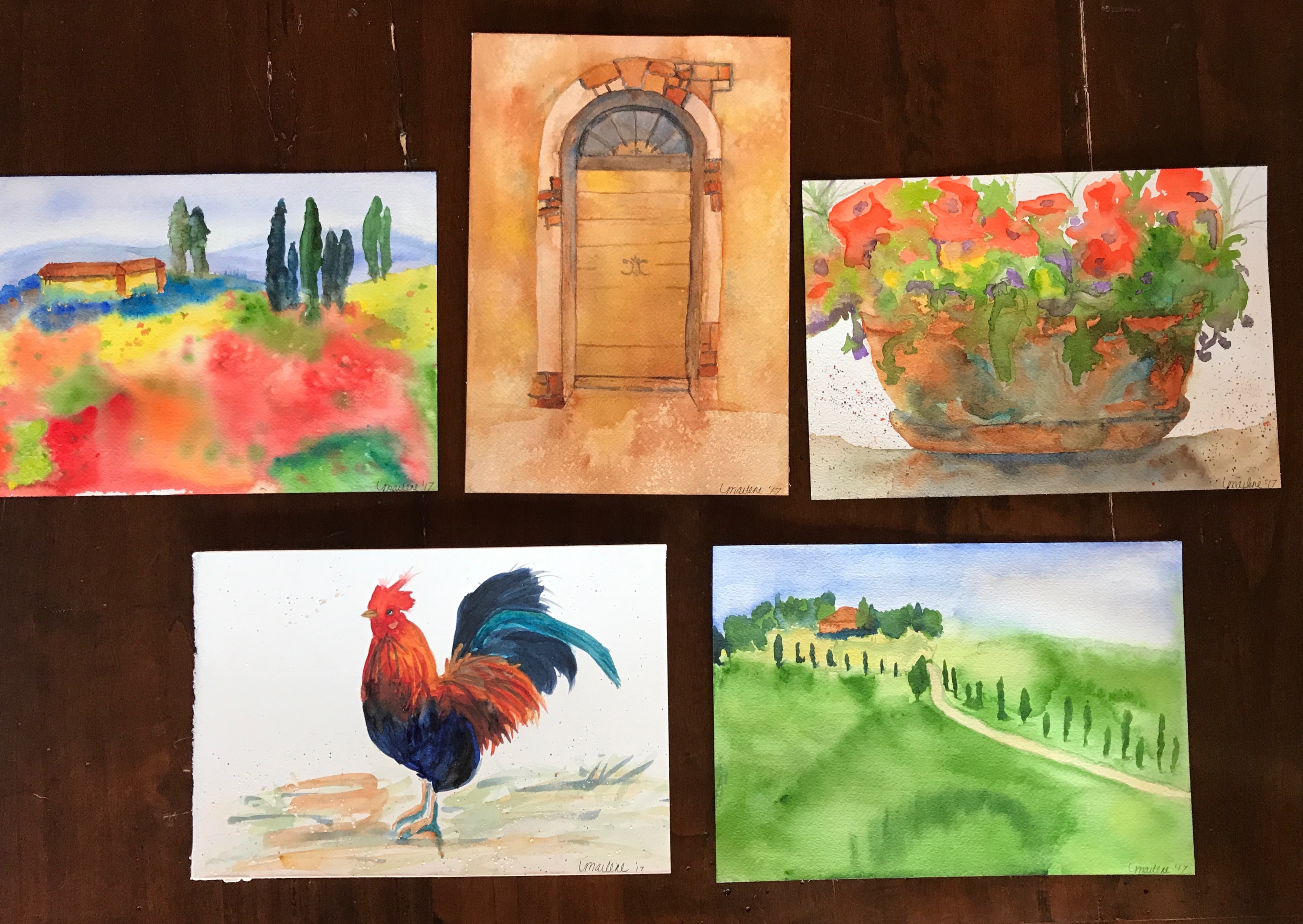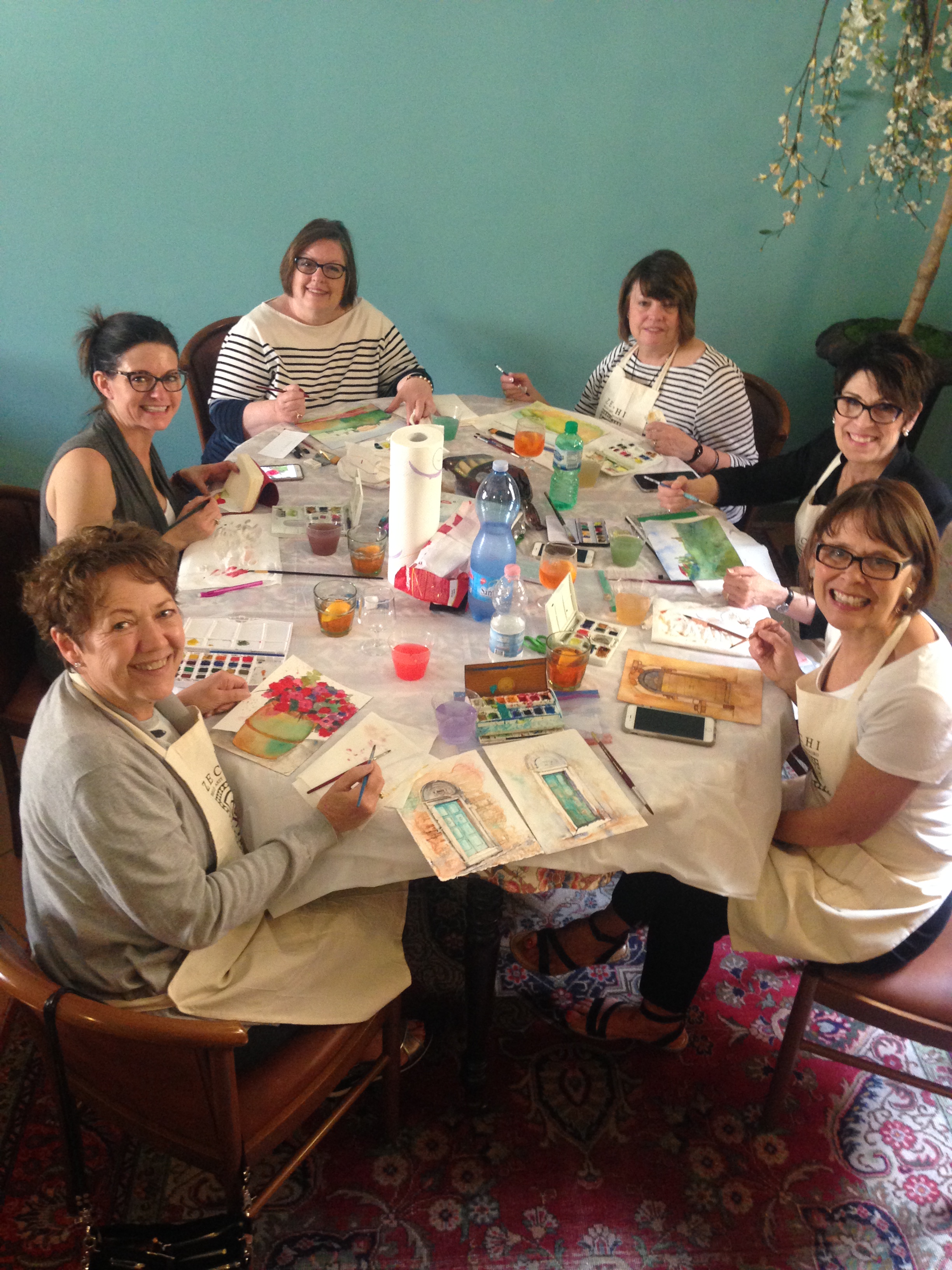 After visiting about 4 or 5 times this trip, I managed to control my purchases and only bought a pad of watercolor paper. They have the most wonderful sable brushes, with their logo imprinted on the side; a treasured purchase I made on my first day here. The group purchased watercolor paints, paper, brushes, and other items. On our first day in Italy, we all purchased aprons from this store that we used for the entire workshop. You can see the aprons in our photo day seven.