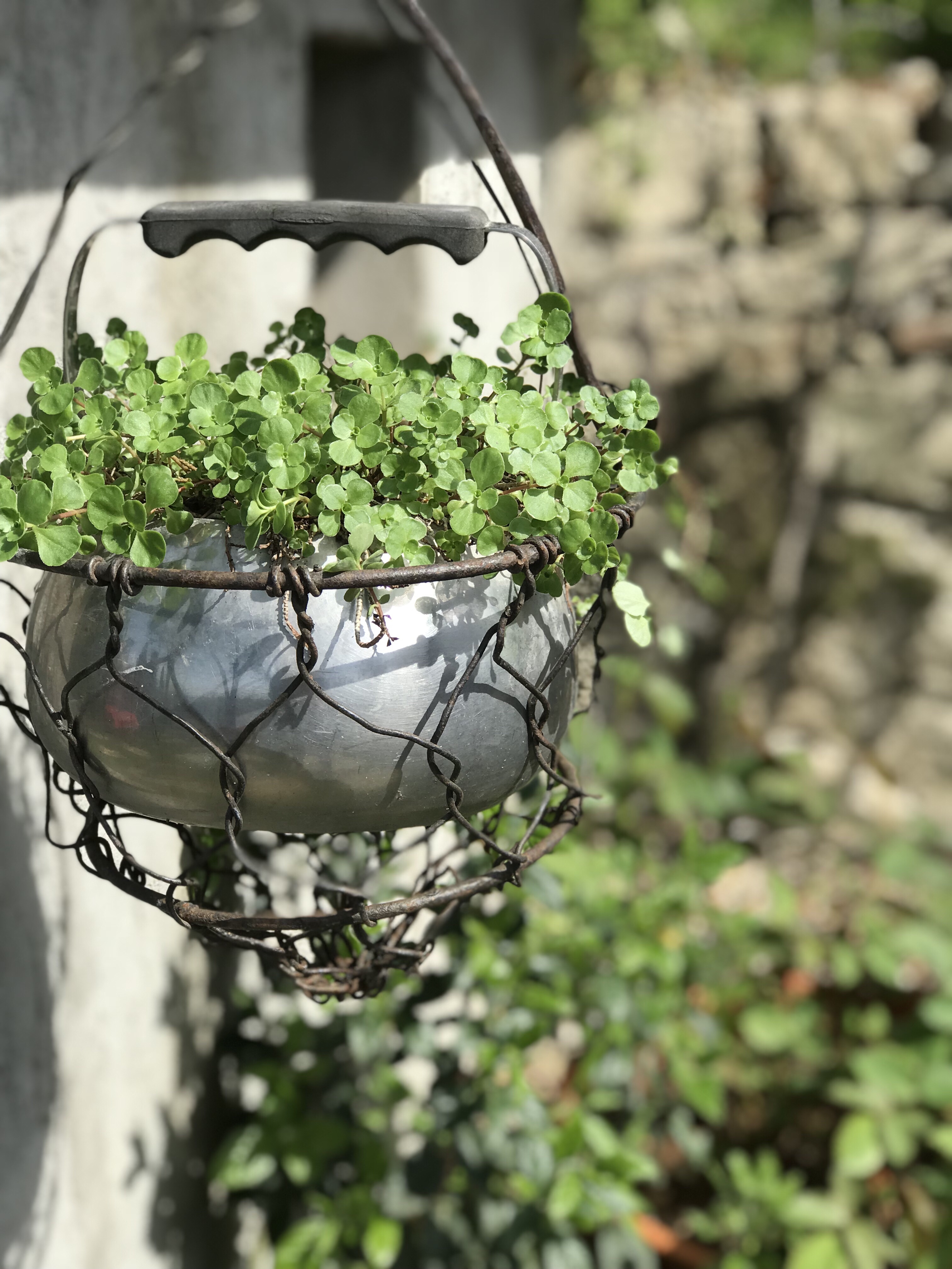 She has beautiful wisteria blooming right now, as well as various potted plants and a colorful clothesline clip collection.