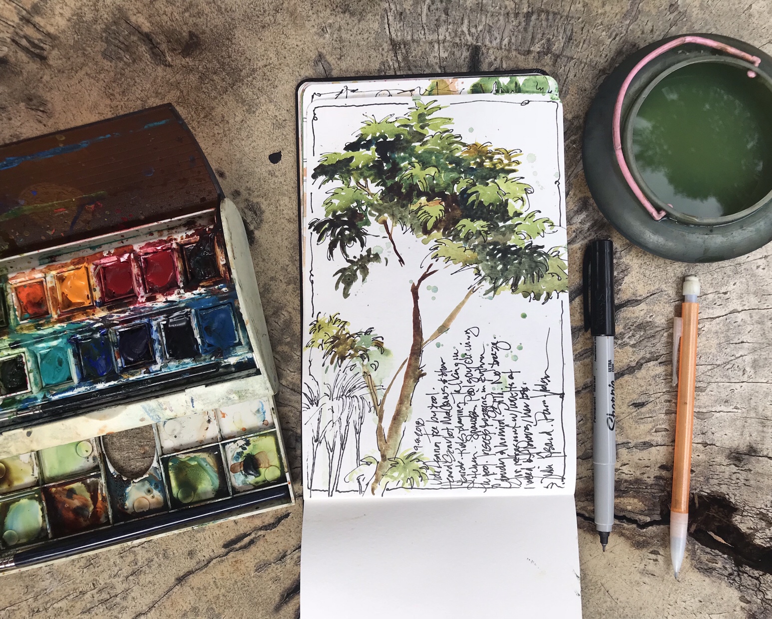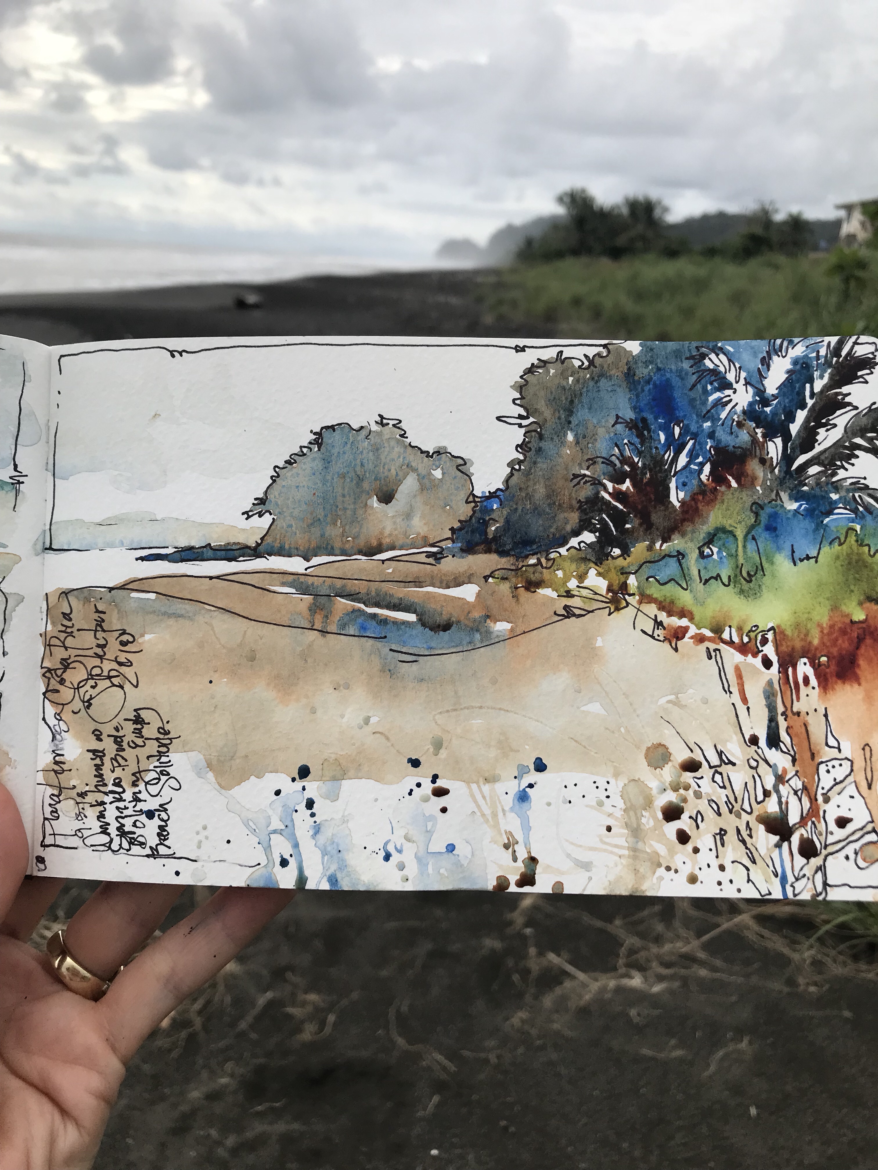 It’s tough to paint at times because of the humidity. Paintings don’t dry well and in fact, seem to get more wet as they sit out! I am adjusting to damp solutions. Also, Sharpies don’t work on wet paper. So I have to draw my black lines an hour or so later at times.