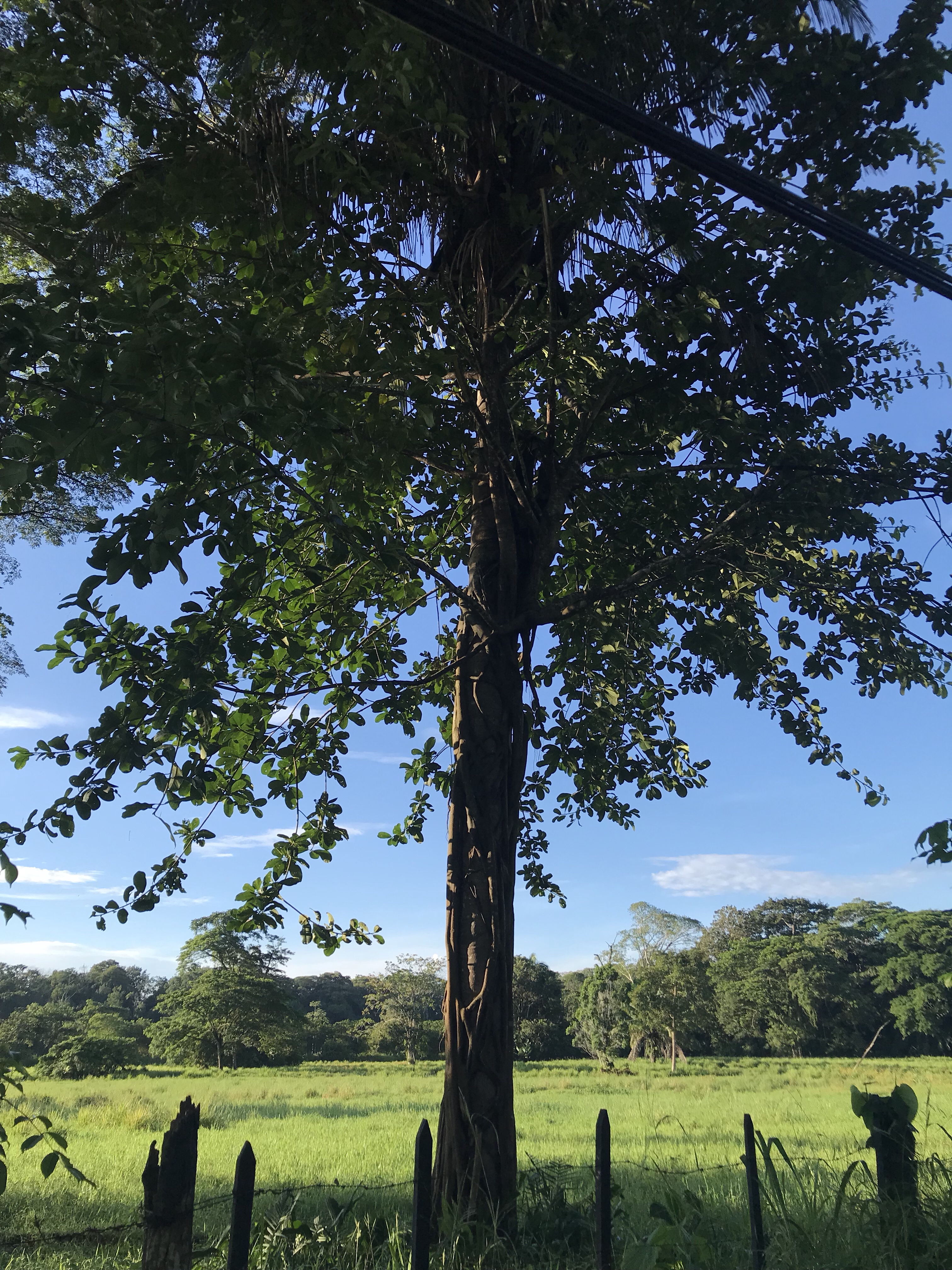 We saw many birds on the 2-hour hike; the blue green grassquit, a roadside hawk(actual name), several ahni, kiskadees, Rufus naped wrens, grackles, and scarlet macaws. We heard a toucan as well but he hid himself in the upper tree canopy. Three huge floating blue butterflies flashed their iridescent wings near a small river. Stunning. Termites created highways up trees and across roads. We looked for, but did not find, basilisk lizards, of which there are usually many, but not this day.